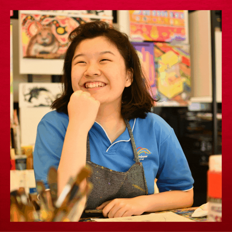 Our budding artists are from Rainbow Centre’s Artability talent development programme for students 15–18 years old, who grow their visual art styles through training and opportunities. They are exposed to a variety of art mediums and advocacy opportunities to partake in the local art scene, through learning journeys or exchanges with professional artists or trainers.